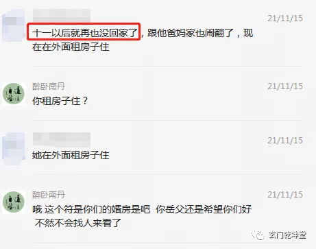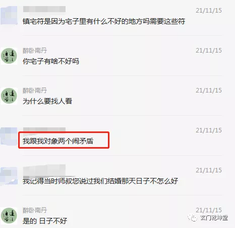 然后11月15的时候找我聊天,他岳父又找了个先生,到处贴满了符。原因是二人已经闹矛盾分居了,(十一国庆后就分居了)岳父还是希望大家好,找人给“看看”。聊天记录如下: