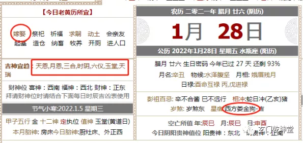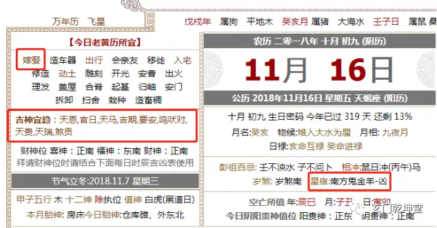 老黄历网站旧版图示如上,上面写的是有天恩、月恩三合吉神,黄历上骇然写着宜“婚嫁”等的文字。这一天很多黄历都写了宜婚嫁,但是这一天是娄金狗值日。如果你真按照黄历选结婚,那就中招了。