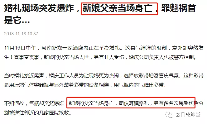 可是这一天是鬼金羊值日,属于金神七煞。结果新娘的父亲当场身亡,司仪耳膜穿孔,另有多名亲属受伤后分别被送往邻近的几家医院抢救。