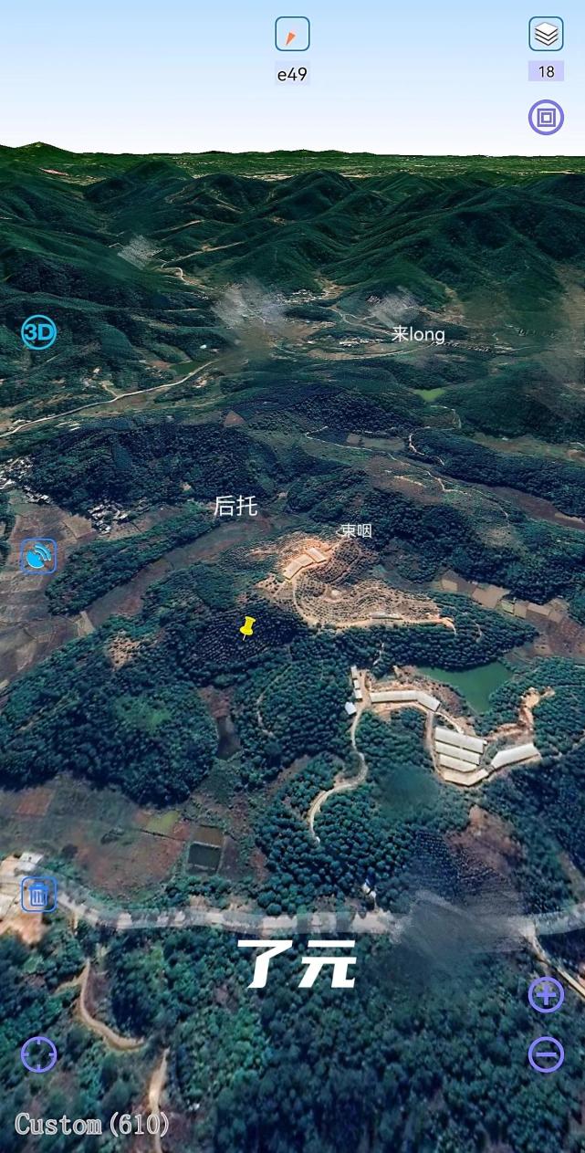 03.卫星图看long脉概况,黄标处即为穴场,long从左后方来,高山落脉丘陵,大跌起伏,行渡左右摆动,行long期间long身拖出高丘作后托,呈抱形展开护卫穴星正后方。