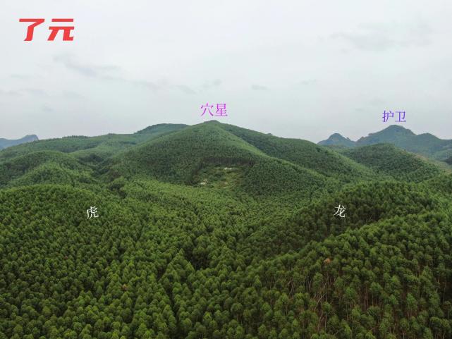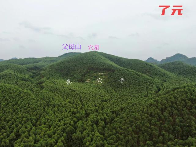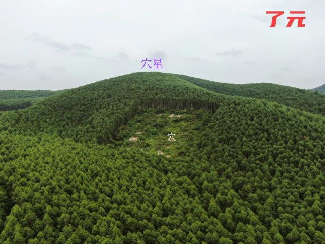 01.无人机于正前方看穴星,穴山金星开窝,稍挂角下脉,穴星窝脉左右有分水,另展开左右肩成窝,这个角度看以为穴山比父母山高,其实是角度问题,实际是父母山比穴星高十米左右