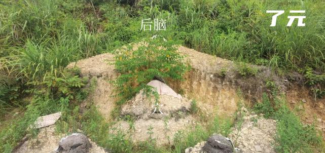 03.无人机正前近看穴场,可见穴场开窝,凌界分明,左右开肩,分水清晰,穴星成形